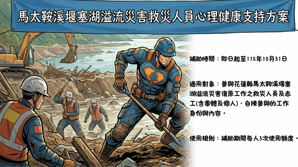馬太鞍溪堰塞湖溢流災害救災人員心理健康支持方案 方案Q&A1.如何才能使用「馬太鞍溪堰塞湖救災人員心理健康支持方案」?參與花蓮縣馬太鞍溪堰塞湖溢流災害復原工作之救災人員及志工(含團體及個人),自陳參與的工作身份與內容。2.如何預約請您填寫下方預約表單,專人安排預約時間。3.會有其他額外費用需支付嗎?不會收取額外的費用。4.會有年齡的限制嗎?沒有。只有要您有參與過馬太鞍溪救災或復原行動即可以本方案。5.方案時間?即日起至115年10月31日止。 致每位親臨現場的救災英雄與鏟子超人:您在搶救災區的過程,看到災後的情況或多或少會帶來些心理陰影,也可能影響到您的日常生活或心理健康,如失眠、情緒異常低落、易受驚嚇、注意力不集中等。如果有上述狀況發生請您別慌張,請先好好照顧自己。心日上心理諮商所配合「馬太鞍溪堰塞湖救災人員心理健康支持方案」,在陪伴與支持中,一起陪您建立更強大的心理韌性和健康生活。 馬太鞍溪堰塞湖救災人員心理健康支持方案預約表單 姓名 身分證字號/居留證號 性別 多元認同女男 生日 電子信箱 聯絡電話 從哪裡找到我們? FBIGThreadsGoogle地圖親友介紹心理師轉介醫師轉介 方便聯繫時間 09:00-12:0013:00-17:0018:00-21:00不方便,請以電子郵件聯絡。 預約服務項目 個別諮商 晤談主題 自我探索生涯探索(如:中年危機、職場轉換等)情緒困擾情感議題(如:伴侶、婚姻等)家庭議題(如:親子教養等)各式孩童發展議題(如:自閉、過動、情緒等)創傷議題(如:人際、性、肢體或語言暴力等)性別議題各式心理疾患(如:憂鬱、焦慮、人格、物質濫用、注意力不足過動症、自閉症等)自我傷害多元文化議題(如:跨文化適應、信仰衝突等) 請簡述您的需求、期待與來訪主因 Δ